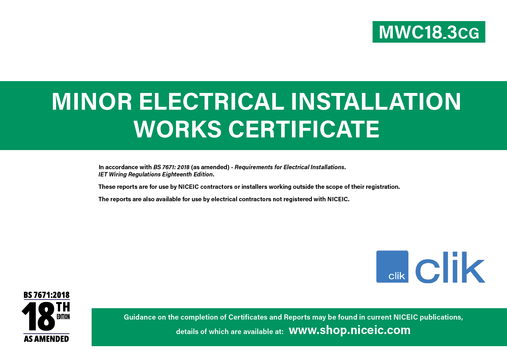 The NICEIC Minor Electrical Installation Works Certificate is to be used only for an addition or an alteration to a single circuit that does not extend to the provision of a new circuit. Examples of where this certificate may be used include the addition of a socket-outlet or a lighting point to an existing circuit. This Certificate may also be used for the replacement of equipment such as accessories or luminaires, but not for the replacement of distribution boards or similar items.